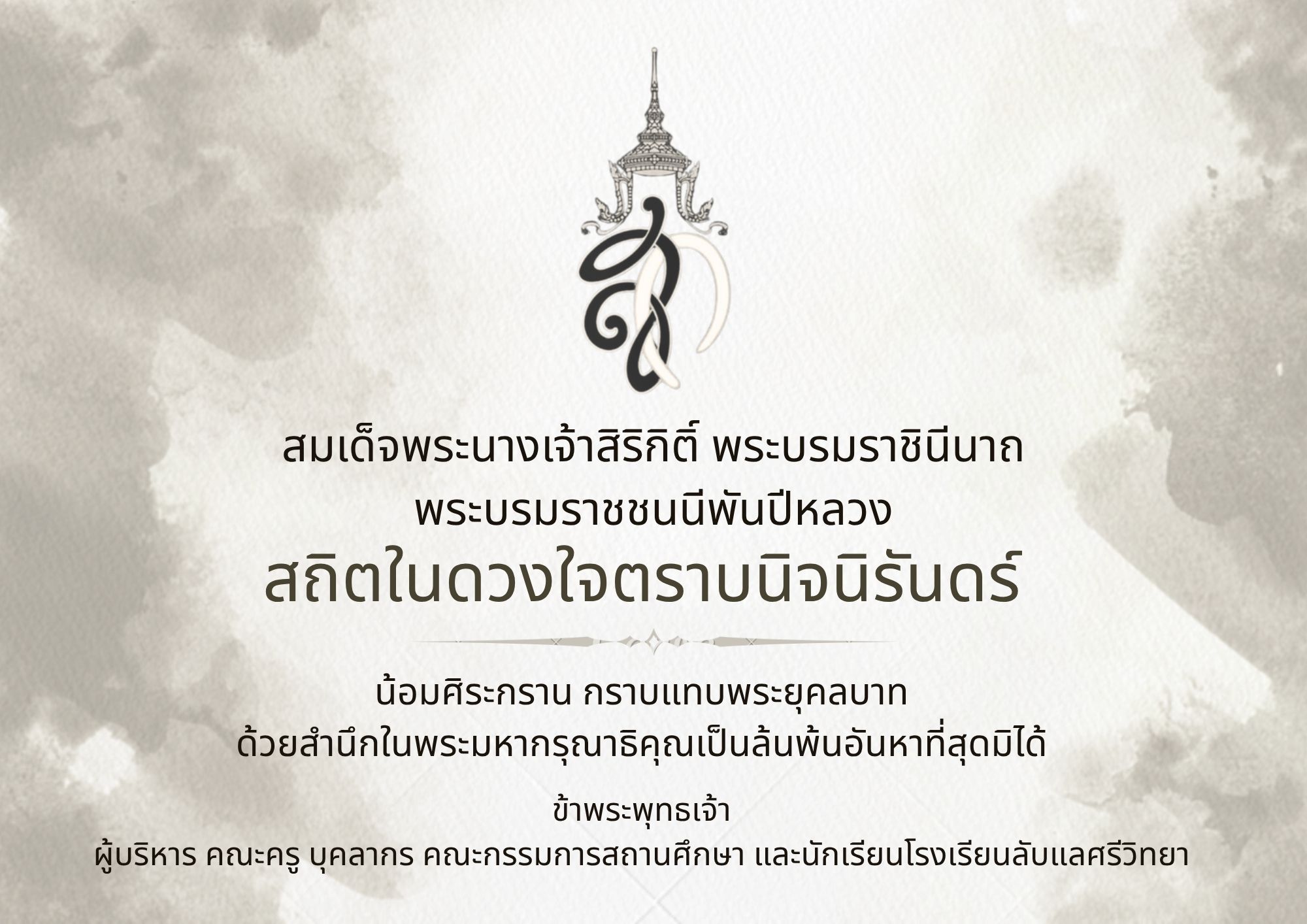 เสด็จสู่สวรรคาลัย น้อมสำนึกในพระมหากรุุณาธิคุณตราบนิจนิรันดร์ ข้าพระพุทธเจ้า ผู้บริหาร คณะครู บุคลากร คณะกรรมการสถานศึกษา และนักเรียนโรงเรียนลับแลศรีวิทยา